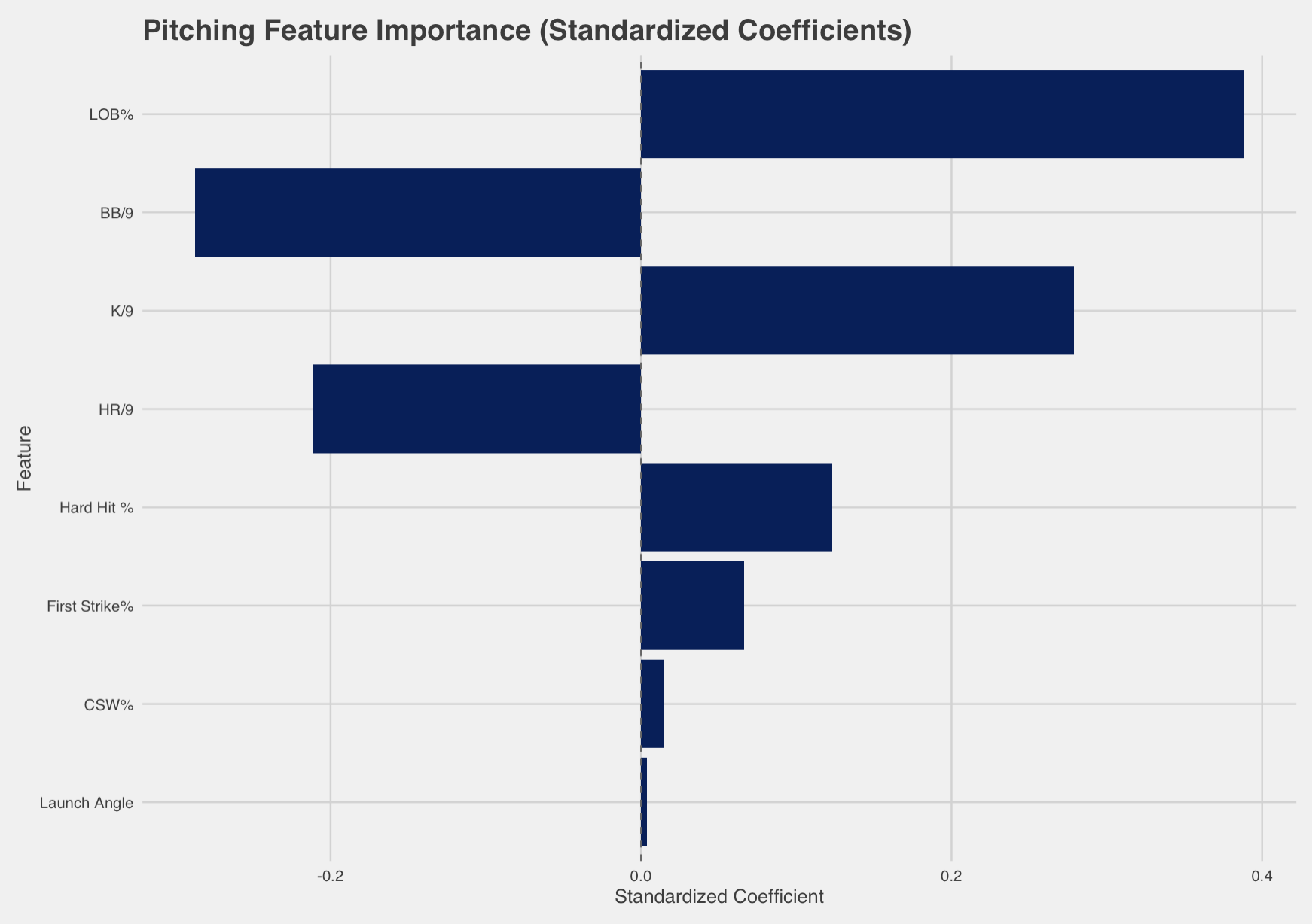 The chart upove illustrates which pitching metrics have the most significant influence on team wins, based on standardized coefficients. LOB% is the top positive predictor, highlighting the importance of stranding baserunners before they become runs. BB/9 and HR/9 are strongly negative, emphasizing the need to avoid walks and limit home runs. K/9 stands out as a key positive factor, reflecting the value of strikeouts. Other stats like Hard Hit % and First Strike % contribute modestly. Overall, the model indicates that pitching success is largely determined by command, strikeout ability, and limiting damage.